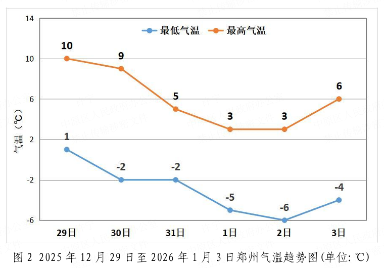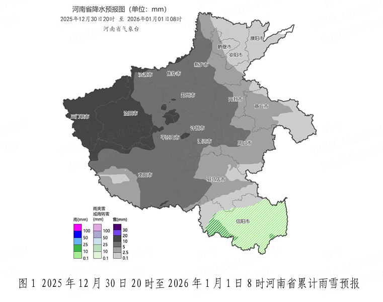 据郑州市气象局第22期《重要天气报告》,30日夜里至31日我市有一次雨雪强降温天气过程,主要降雪时段在31日白天到夜里,降水量5-8毫米,局部10-15毫米。此次过程相态转换复杂,其中30日夜里到31日凌晨零星小雨转雨夹雪,31日雨夹雪转中到大雪,西部山区局部暴雪,最大积雪深度4-8厘米。过程伴有3-4级东北风,阵风6级左右。元旦假期气温较前期大幅下降,最低气温降至零下6℃到零下5℃。